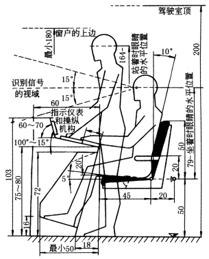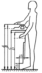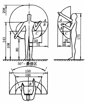 210——站着时手可达到区 197——门高 195——手方便地可达到区的上限 190——隔板布置的最高高度 180——操纵机构布置的最高高度 175——指示器布置的最高高度,坐着时可达到区 |