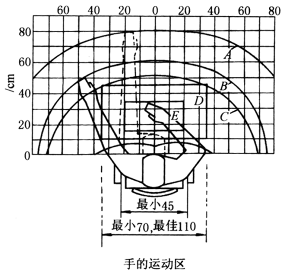 A——最大可达到区域,在此区内,完成手工操作需要用一定的力 B——伸直手臂时,手指可达到区域 C——手掌容易达到区域 D——粗的手工工作最佳的可达到区域 E——精度和手艺要求很高的手工劳动的最佳可达到区域 本图尺寸推荐用于中等身高的男性,坐在高70cm左右的工作台前。对于女性,到达区应该减小10% |