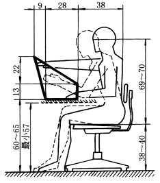 设计原则: 1.需力越大,应该越低 2.要求视力越强,应该越高 3.高度还决定于工作时人体的姿势、操纵机构的大小和操作者的身高 A——要求手臂运动有较高精度的工作(钟表组装),88±2 B——视力强度较高的工作,84±2 C——一般工作台74±2;会议桌69~70 D——打字桌,需要较大力气才能完成的工作的工作台66±2 E——放腿空间的最低高度,60 |