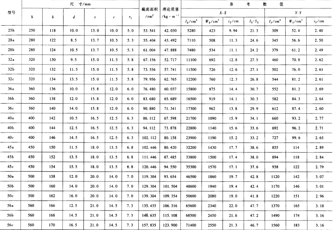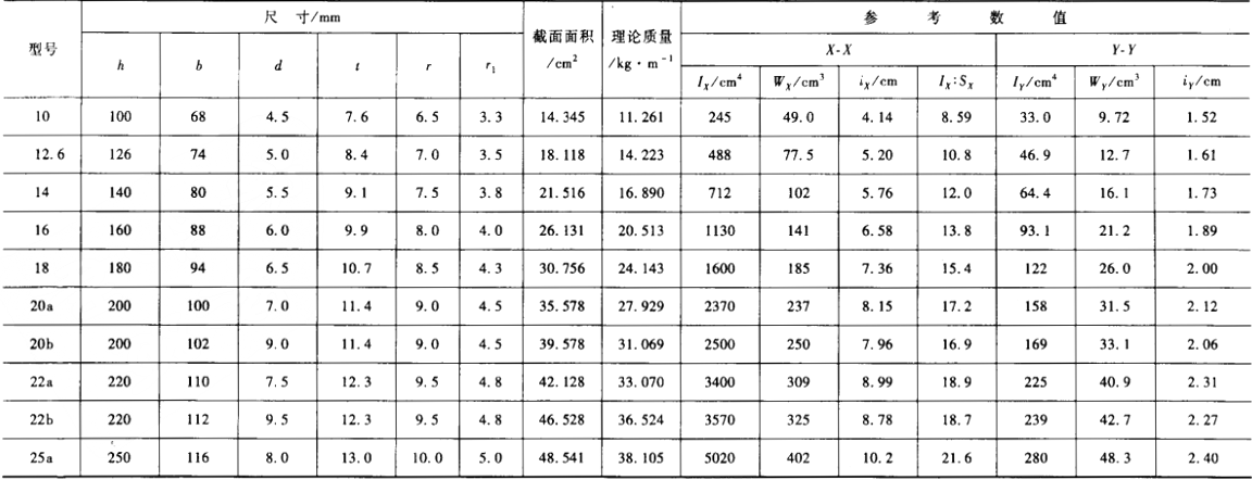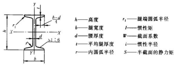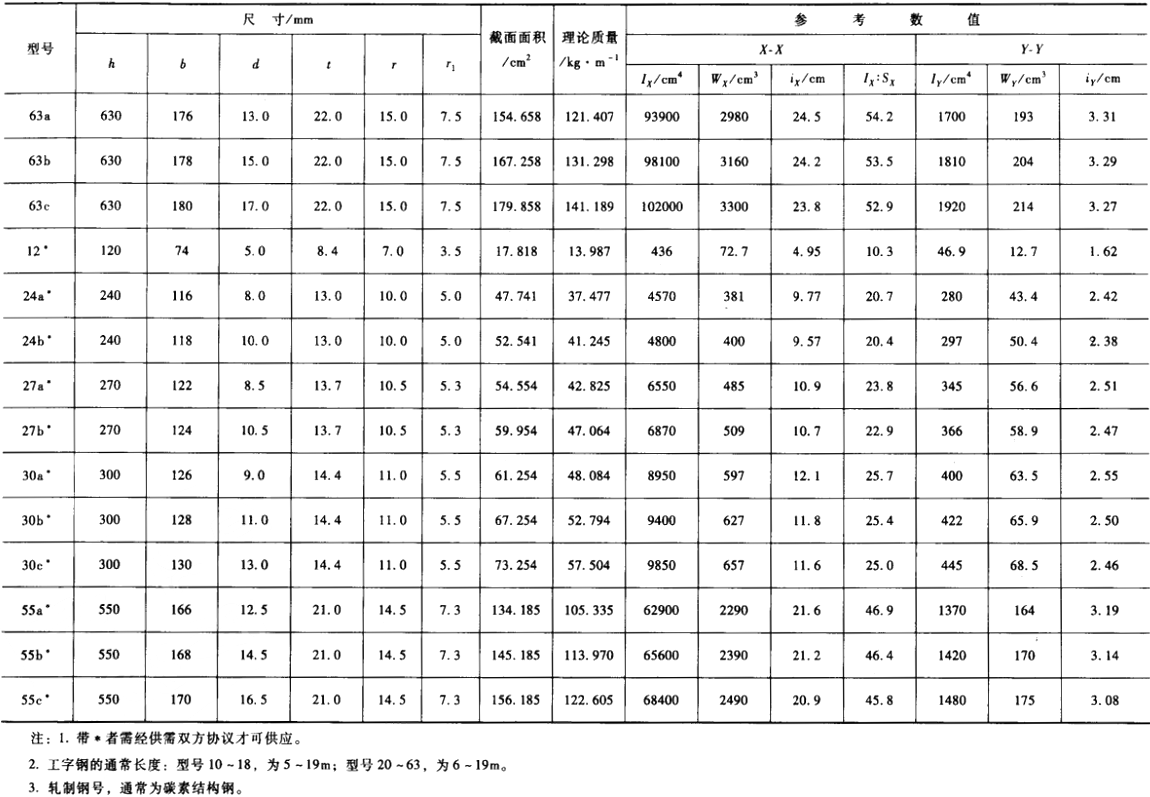 摘自《GB 706-1988 热轧工字钢尺寸、外形、重量及允许偏差》