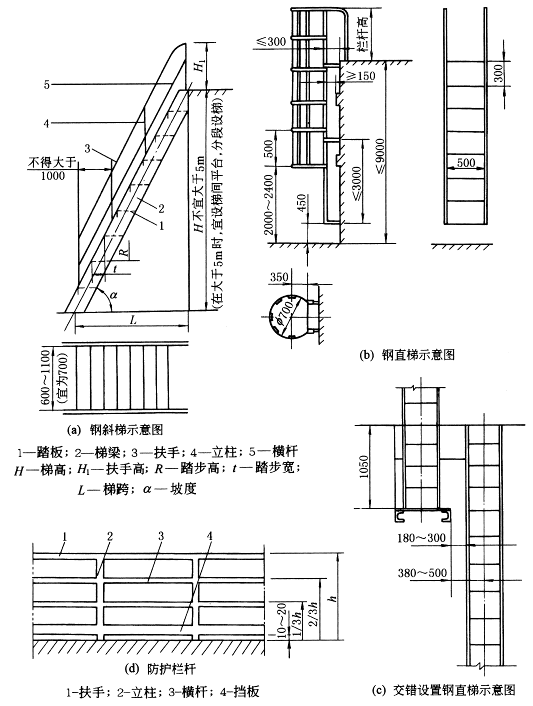 踏板:δ≥4mm花纹钢板,或经防滑处理的普通钢板,或由25×4扁钢和小角钢组焊成的格子板 扶手:H=900mm,或按GB 4053.3中规定的栏杆高度。采用外径为f 30~f 50mm,壁厚不小于2.5mm的管材 立柱:用不小于40×40×4角钢,或外径为f 30~f 50mm管材,从第一级踏板开始设置,间距不宜大于1000mm 横杆:采用直径不小于f 16mm圆钢或30×4扁钢,固定在立柱中部 梯梁:采用性能不低于Q235-A·F钢材,其截面尺寸应通过计算确定 |