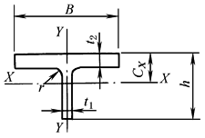 | h———高度 B———宽度 t1———腹板厚度 t2———翼缘厚度 CX———质心距离 r———圆角半径 标记:T 后加高度×宽度×腹板厚度×翼缘厚度 如:T200×400×13×21 |